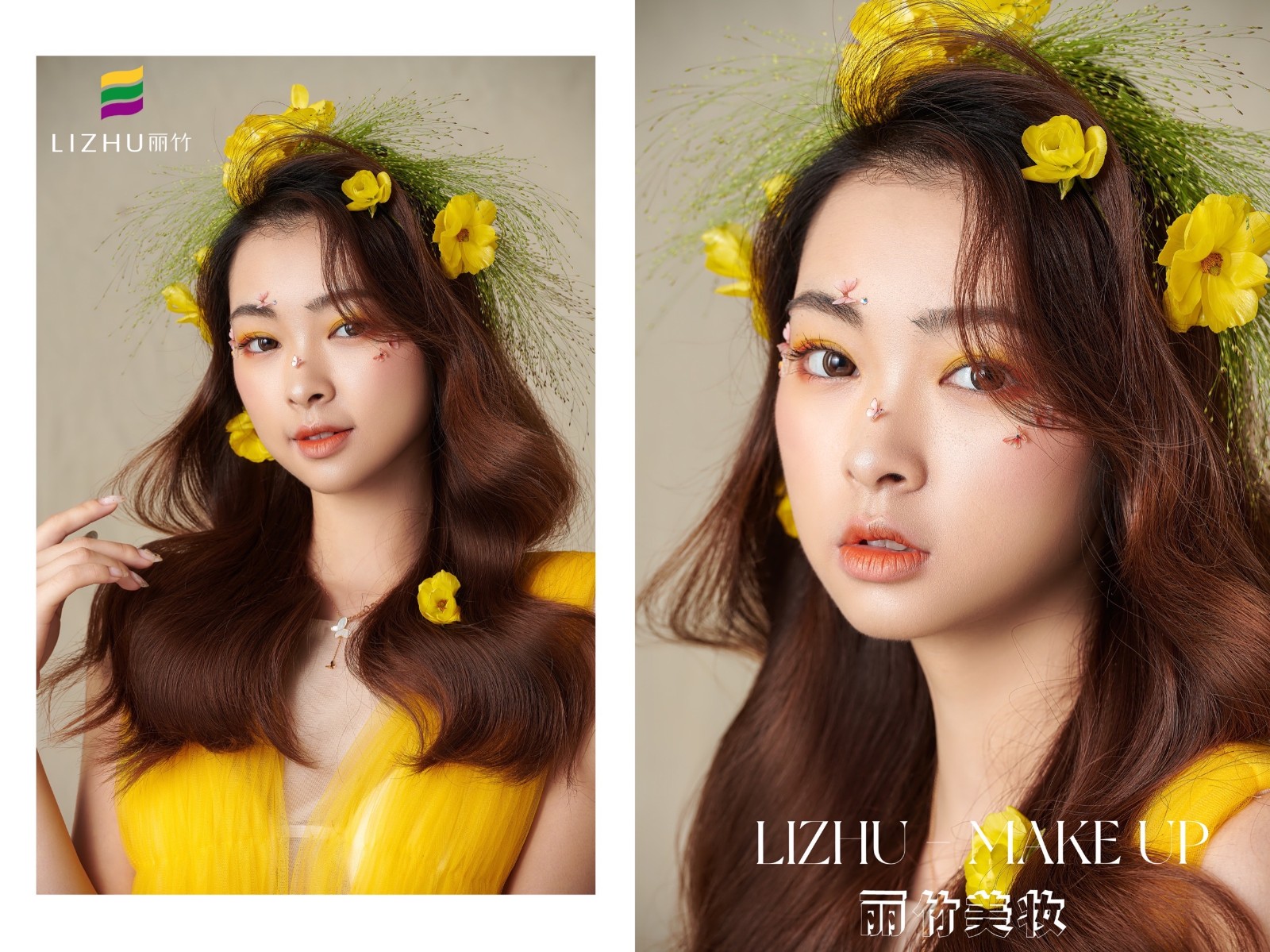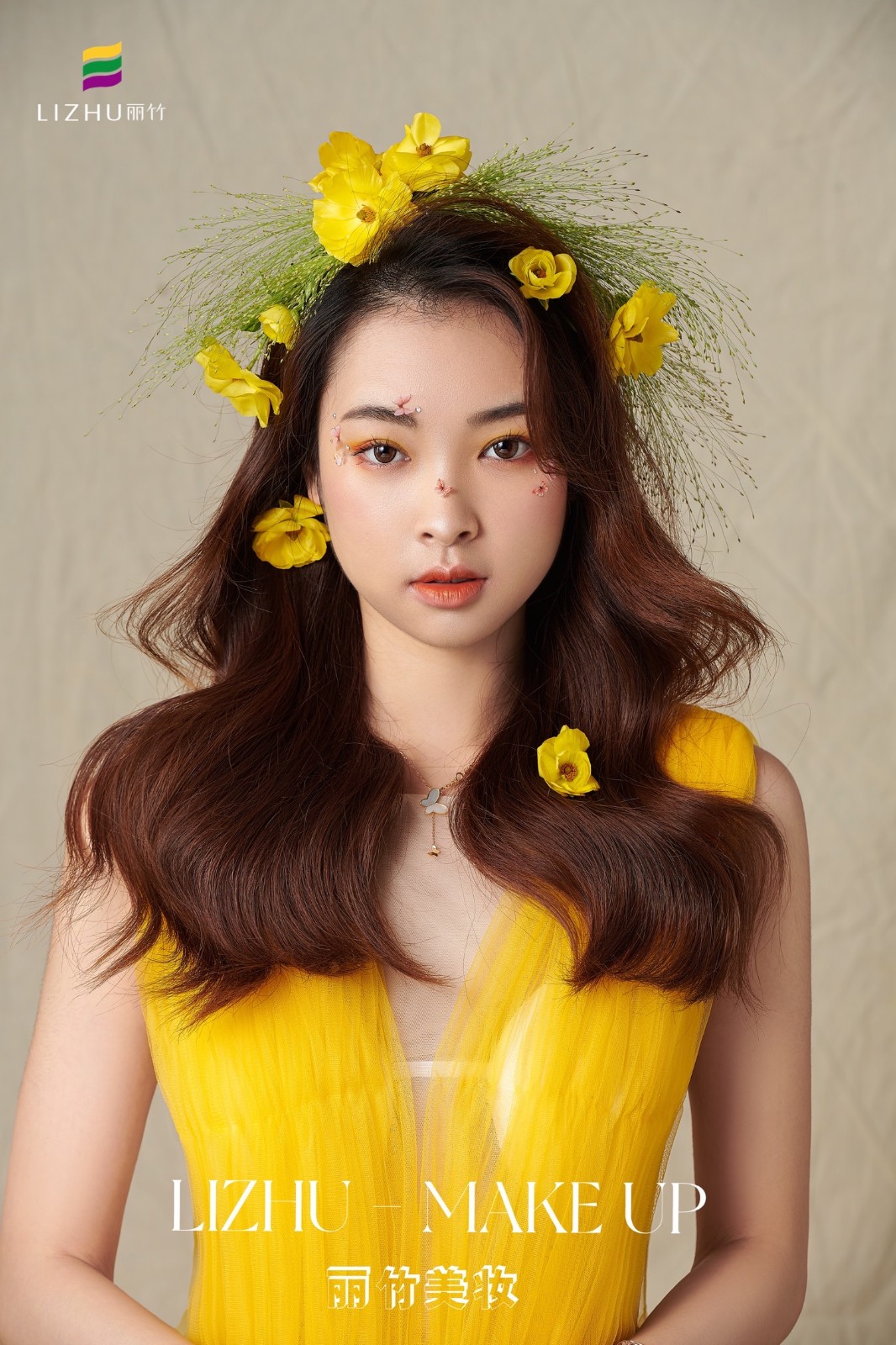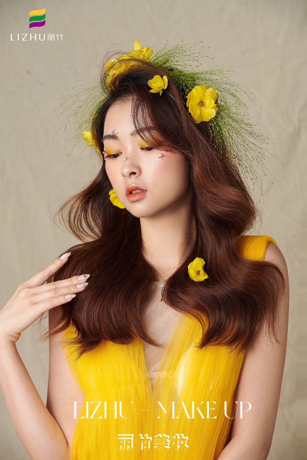 麗竹化妝學校作品---輕氧花漾披發(fā)造型:清新自然嫩膚柔細,發(fā)絲宛若三月春風,繁華似錦帶來神秘曼妙,清透靈動述說少女心事。