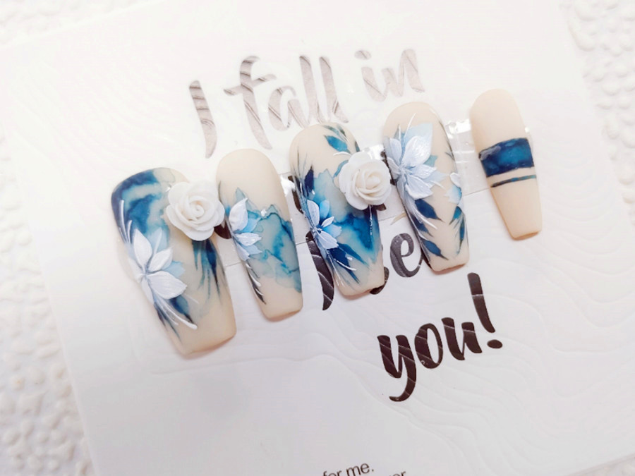 南寧美甲師、南寧美甲培訓(xùn)排名:水墨畫是非常有中華民族特色的一種繪畫形式,具有單純性、象征性、自然性。它具有水乳交融,酣暢淋漓的藝術(shù)效果。整副美甲以乳白色打底,蘸取深藍(lán)色彩繪膠,使用暈染的手法打造出水墨虛實(shí)相交的效果。然后在用白色雕花膠捏出立體花瓣,這樣一副栩栩如生的國(guó)風(fēng)雕花美甲便完成了。