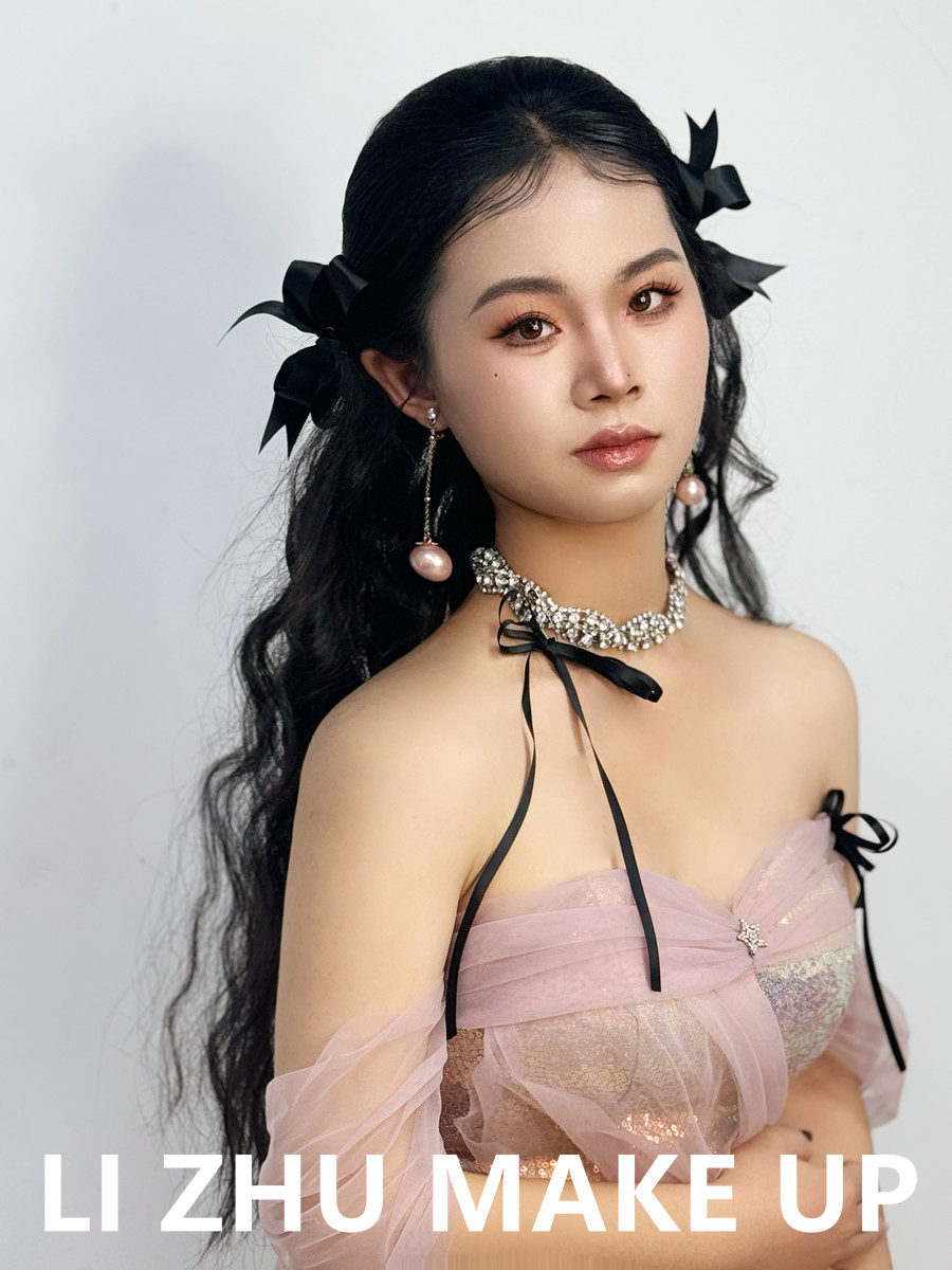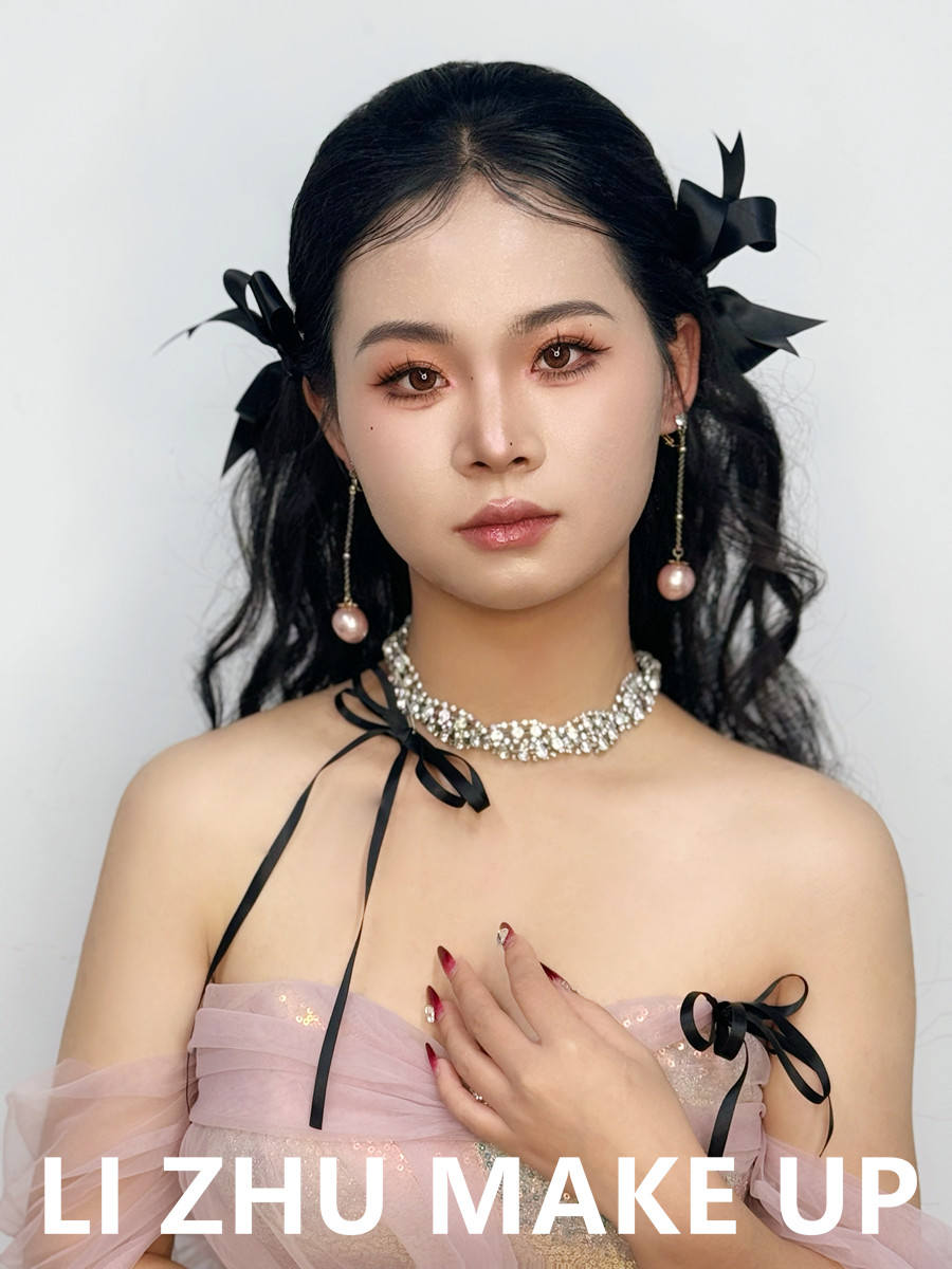 南寧化妝形象設(shè)計(jì)、南寧學(xué)化妝零經(jīng)驗(yàn)、南寧化妝培訓(xùn)進(jìn)修提升(麗竹化妝造型學(xué)校)作品---韓式甜美新娘:自然服貼的韓式底妝,粉橘色亮眼的眼妝和唇妝,成套蝴蝶結(jié)飾品點(diǎn)綴,讓身著粉色紗質(zhì)禮服造型更加甜美。