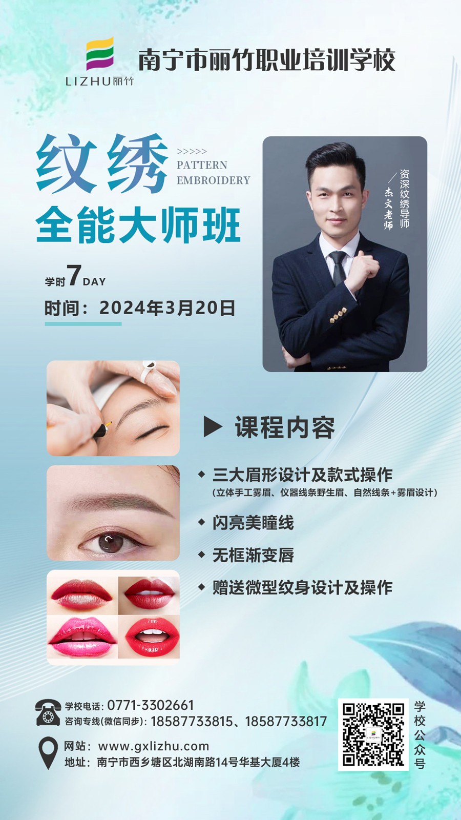 廣西紋繡、廣西紋繡進(jìn)修:廣西南寧紋繡職業(yè)學(xué)校將在3月20日進(jìn)行廣西眉眼唇培訓(xùn)班(麗竹紋繡大師班)培訓(xùn)課程。行業(yè)紋繡導(dǎo)師(杰文老師)手把手,一對一全程指導(dǎo),學(xué)習(xí)席位備受歡迎,如果不想錯(cuò)過此次課程,趕緊聯(lián)系我們報(bào)名吧!