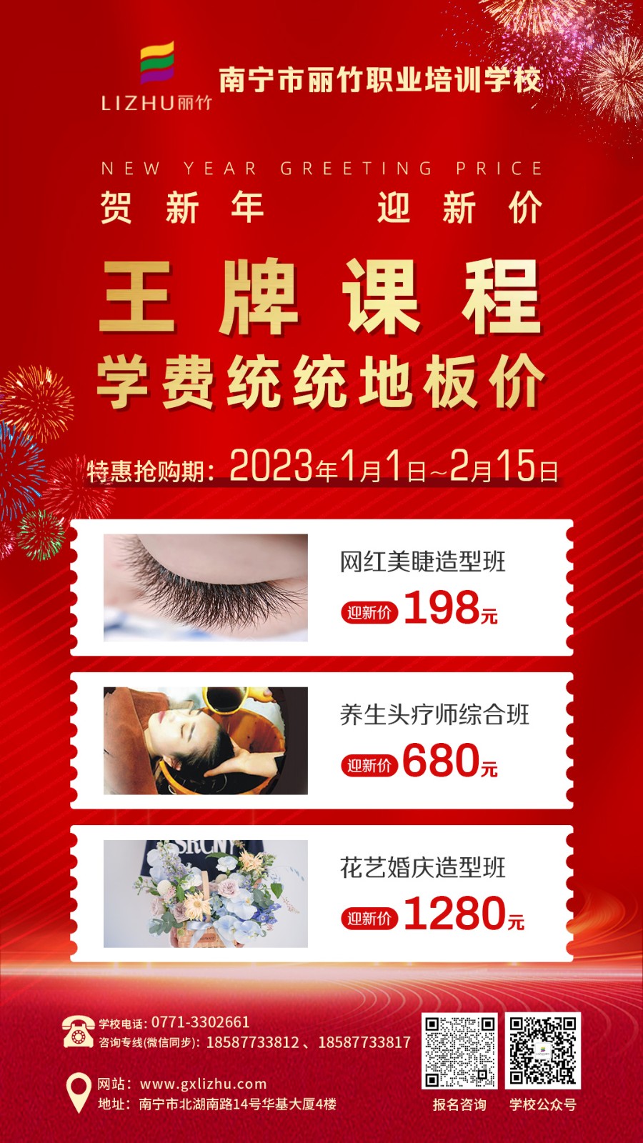 廣西培養(yǎng)美容師美發(fā)師學校、廣西南寧化妝美甲學校:風雨過后是彩虹,疫情的全面解封也預示著我們也將迎來的新征程。為了答謝一路以來大家不離不棄的陪伴,廣西美業(yè)職業(yè)學校-麗竹學校迎新跨年“惠”活動從1月1日繼續(xù)延長至2月15日,帶你引爆整個春節(jié)。